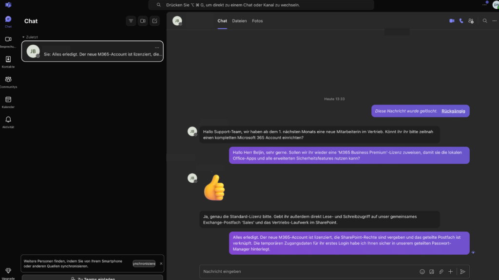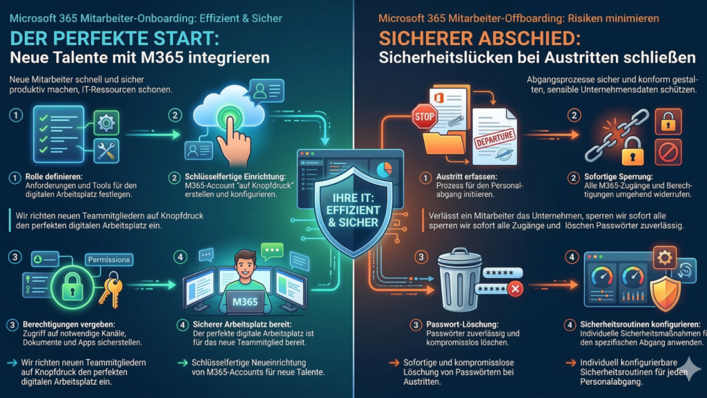 Vor allem bei Mitarbeiterwechseln müssen Sie schauen, dass der Ex-Mitarbeiter aus allen Systemen geschmissen wird, sowie „der Neue“ einen Zugang zu M365 bekommt.
